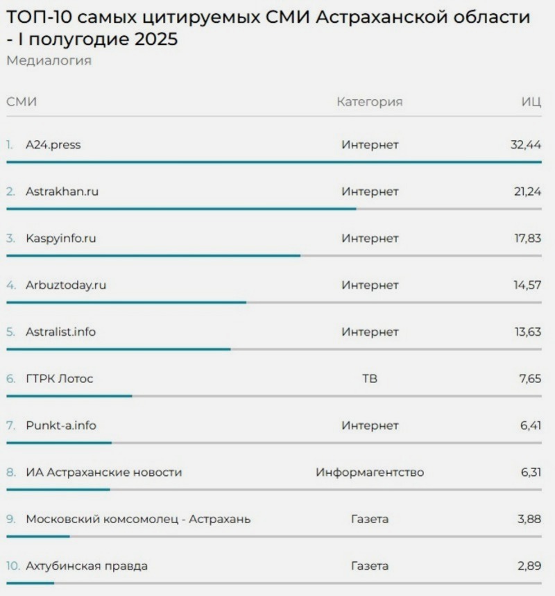 В десятку лидеров вошли крупнейшие интернет-издания, телеканалы, агентства и газеты региона. Первую строчку рейтинга вновь заняло сетевое издание «Астрахань 24», вторую и третью позиции сохранили сайты «Астрахань.ру» и «КаспийИнфо».